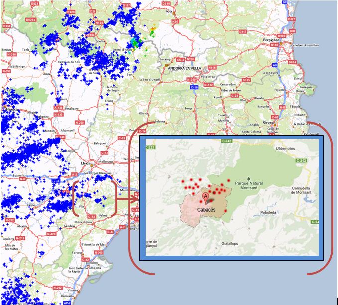 Entre las 20.45 y las 21.30 horas se registraron varios impactos de rayos en los municipios de La Bisbal de Falset, Cabacés y Margalef ubicados en el Parque Natural del Montsant, provincia de Tarragona.